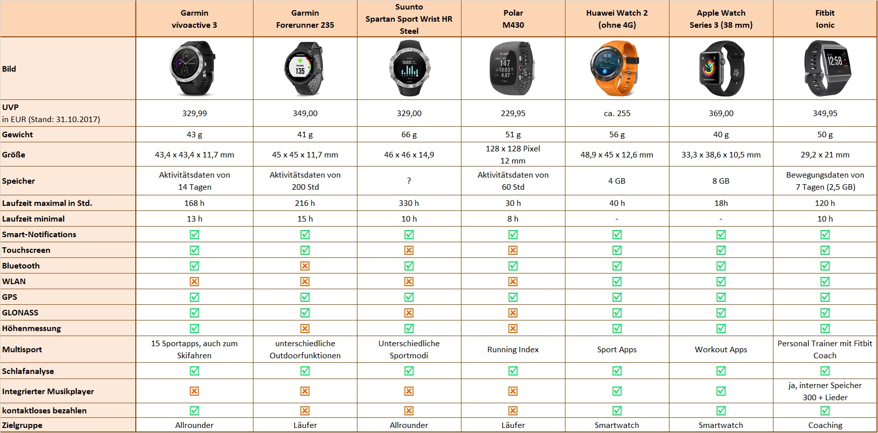 Ich würde gerne meine Recherche mit Euch teilen. Alle Uhren haben Pulsmessung am Handgelenk und sind wasserdicht. Sie sind alle mit IOS und Android kompatibel. Mein persönlicher Favorit ist die Garmin vívoactive 3. Diese werde ich mir kaufen, testen und die Ergebnisse mit euch teilen.