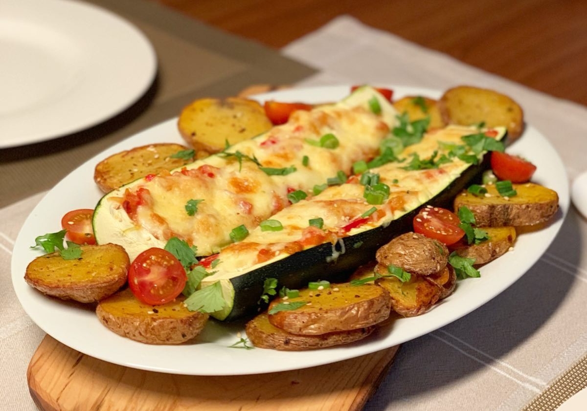 Kartoffeln nach Wahl zubereiten (hier in der Heißluftfritteuse). Ofen auf 200 °C Ober-/ Unterhitze vorheizen. Tomaten-Basis zubereiten: Dafür Zwiebeln, Paprika, Tomaten & Frühlingszwiebeln klein schneiden. Zwiebeln und Paprika in Olivenöl anbraten, Tomaten und Frühlingszwiebeln dazu geben und salzen. Zucchini aushöhlen und mit der Tomaten-Basis, mit Mozzarella Stückchen und geriebenem Gouda füllen und ab in den Ofen für 20 Minuten. Alles gemeinsam anrichten und mit Toppings verzieren, z.B. Frühlingszwiebeln, Koriander und gerösteter Sesam.