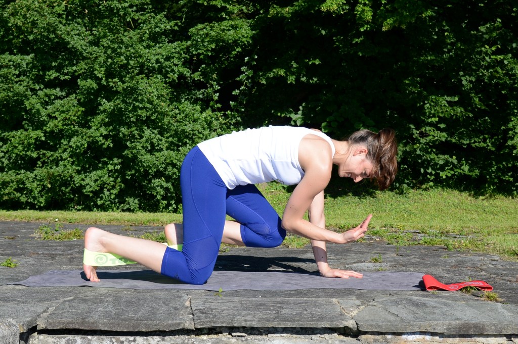 - So wird’s gemacht: Mini Band um die Füße wickeln. Ausgangsposition ist der Vierfüßlerstand, Blick nach unten. Dein Kopf bildet die Verlängerung der Wirbelsäule. Strecke einen Arm und das gegenüberliegende Bein aus. Führe Ellbogen und Knie zusammen und setze Arm und Bein nicht ab. Atme ruhig und gleichmäßig weiter. Vergiss nicht die andere Seite!