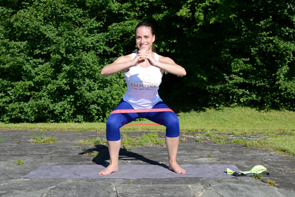 - So wird’s gemacht: Das Mini Band ist wieder oberhalb Deiner Fußgelenke. Du beginnst im aufrechten Stand und gehst in die Kniebeuge. Danach drückst Du Dich über die Fersen ab und springst so hoch wie möglich. Sobald Du „gelandet“ bist, gehst Du direkt wieder in die Kniebeuge.