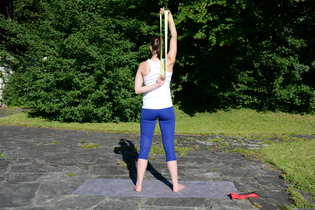 - So wird’s gemacht: Nimm das Fitnessband mit beiden Händen und führe es hinter den Körper, als würdest Du die Hände hinter dem Körper zusammenführen. Nun ziehe die Hand des oberen Armes über Deinen Kopf, wobei sich nur der Unterarm bewegt. Achtung: Der untere Arm verbleibt in seiner Position.